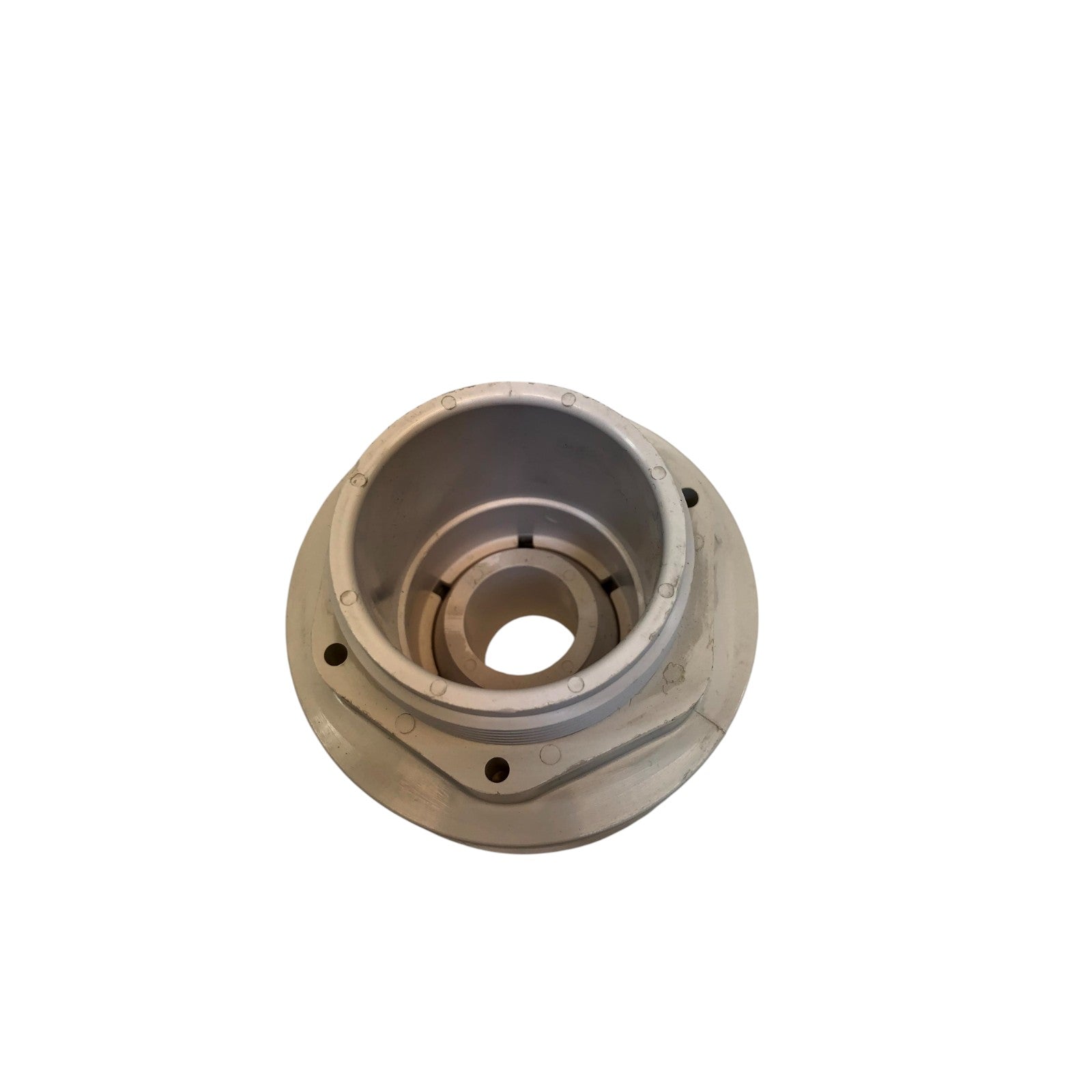 Vitt returinlopp för pool – ett riktbart munstycke (“eyeball/ball jet”) som återför filtrerat vatten tillbaka i bassängen. Konstruktionen ger kontrollerad riktning och hastighet på vattenströmmen, vilket förbättrar ytavskumning, cirkulation och kemikaliespridning.